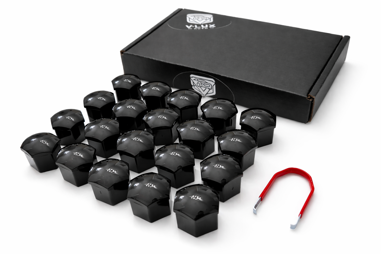 • 20 × Glossy black lug nut covers